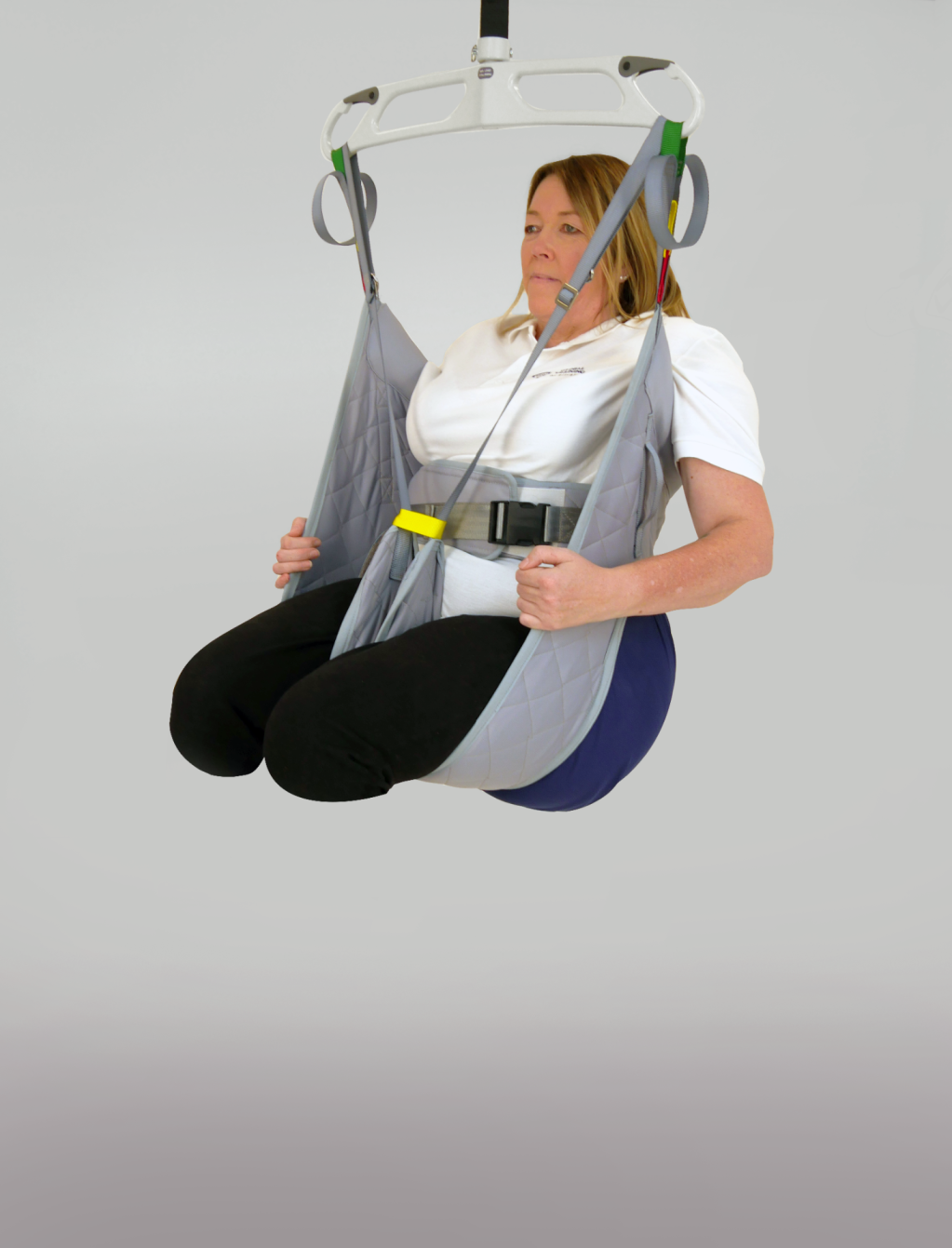 The Amputee Pocket is a specialised sling designed for individuals with short amputations, available in single and bilateral configurations. It features soft towelling-lined pockets and padded support for comfort during transfers. Suitable for users with good upper body tone, it provides excellent access for hygiene, underarm padded rolls for added comfort, and a built-in waist support for stability. Adjustable leg tapes ensure a tailored fit, and colour-coded shoulder tapes facilitate easy application. A full risk assessment is recommended for safe use. This sling prioritises comfort, safety, and functionality for individuals with unique mobility needs.