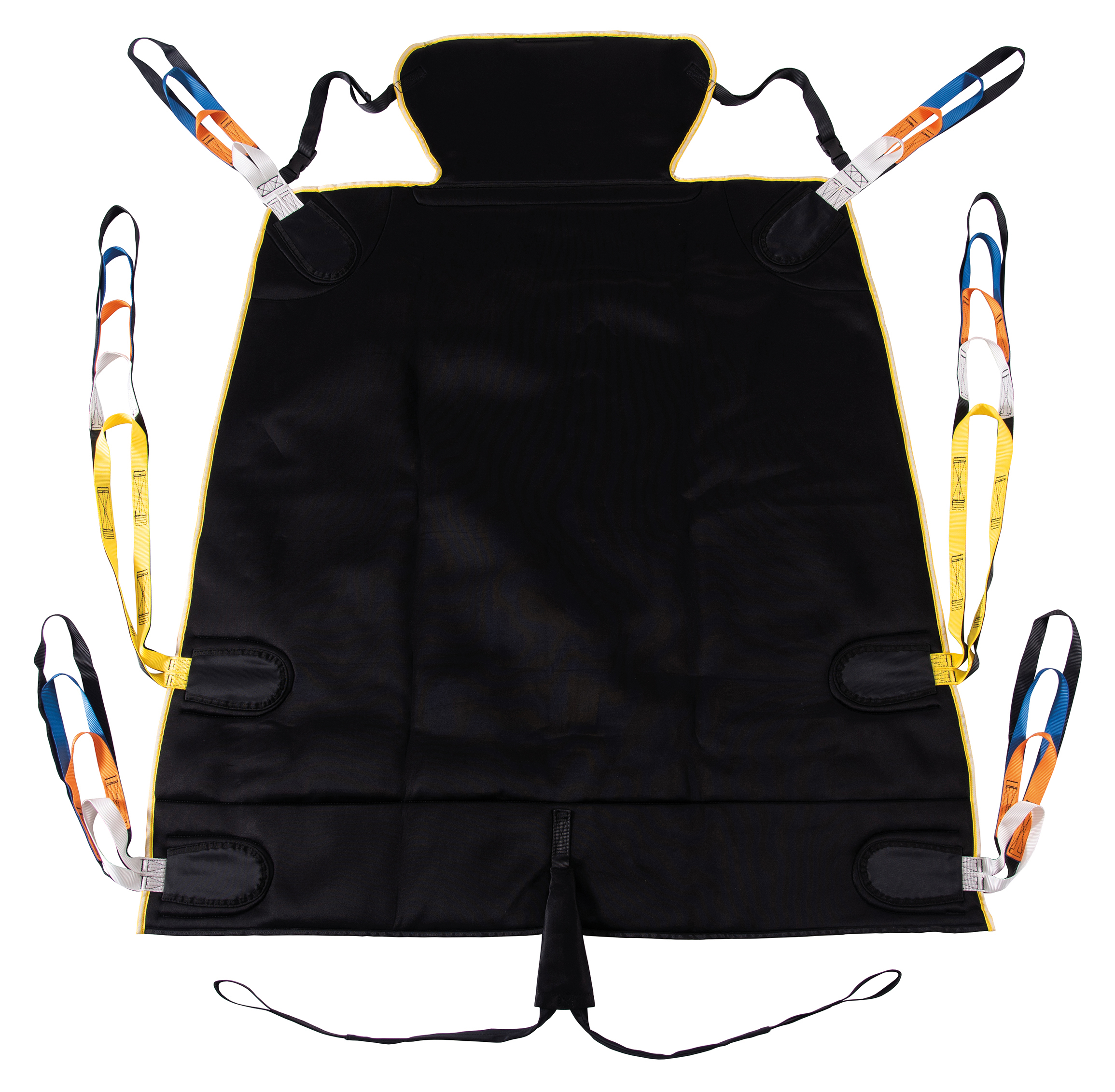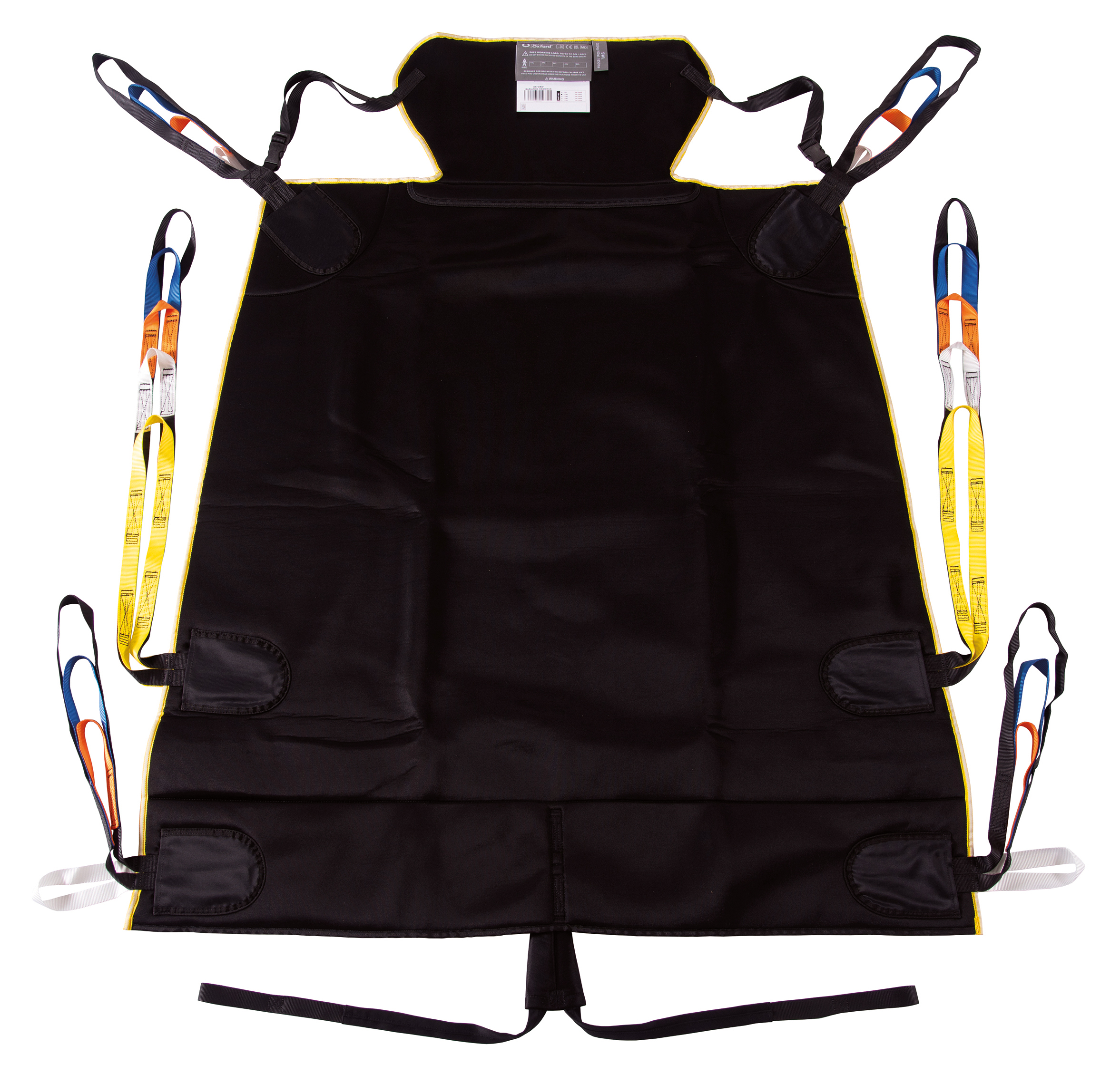 Seamless design offers minimal pressure points, integrated head support for additional comfort and support, integrated storage pockets for sling straps and integrated pommel offers added patient security. Colour coded binding indicates sling size and coloured attachment loops promote correct/safe positioning.