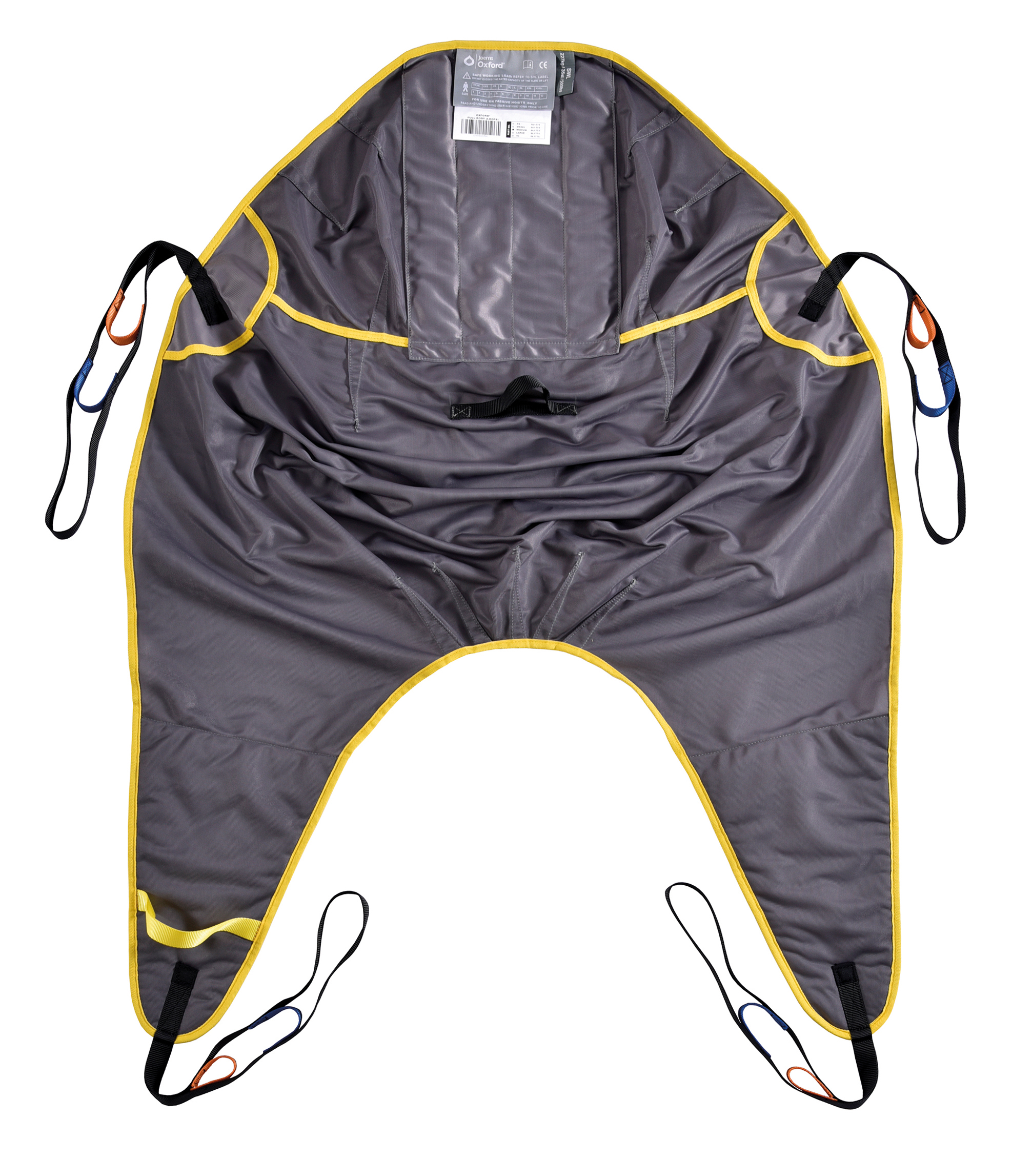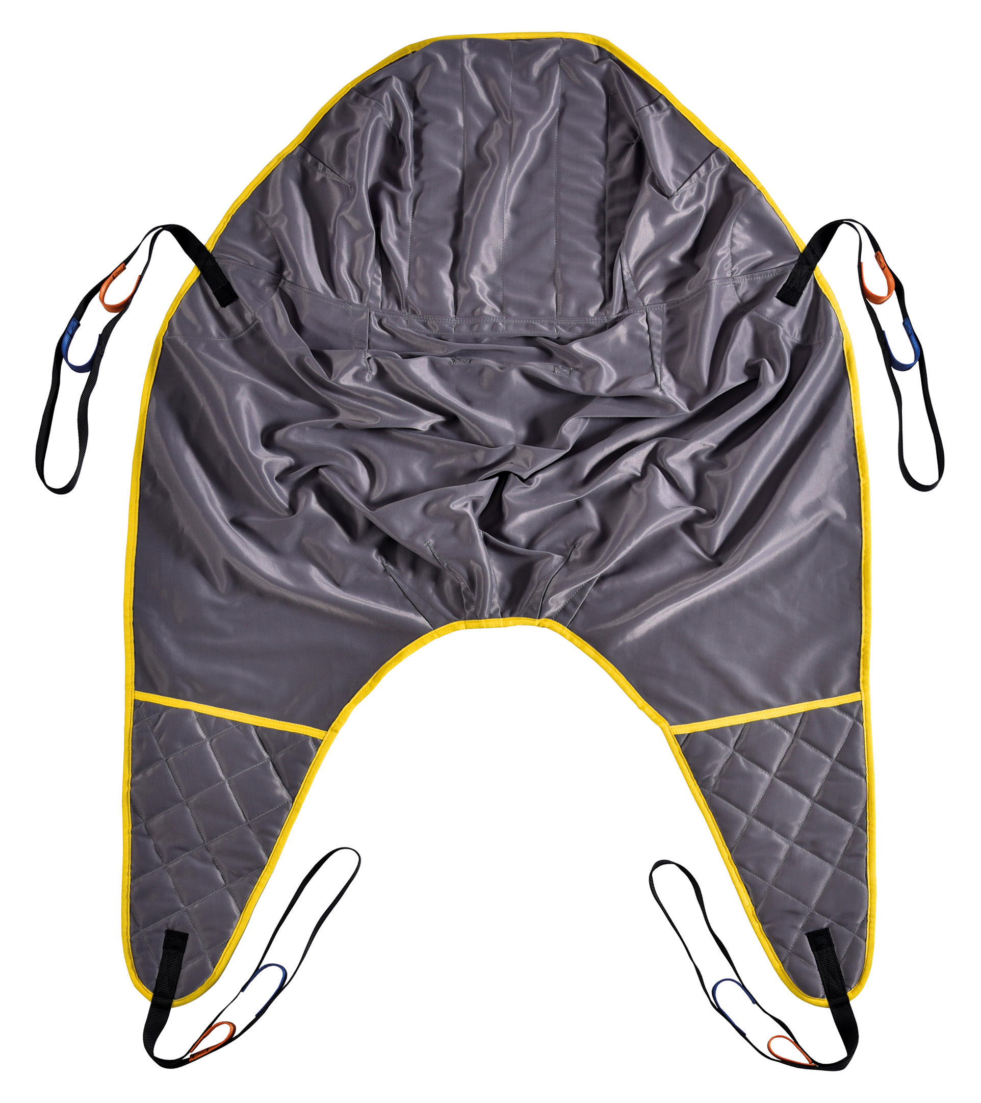 Available in polyester or net material options as standard. Has removable head support ‘bones’ as standard, positioning handles which allow easy patient repositioning, colour coded binding which indicates sling size, coloured attachment loops which promote correct/safe positioning and modesty loop which help protect patient dignity during transfer. Can be customised to fulfil patient specific needs.